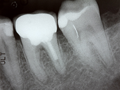 | 歯冠部分がほぼ溶けてなくなった状態。神経が死ぬため、痛みがいったん止みますが、歯根の先に膿が溜まると再び激しく痛みます。 |