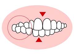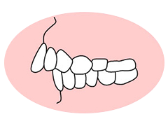 | 上の歯列が下の歯列を極端に覆っている状態。オーバーバイトとも呼ばれ、食べ物が咬みにくかったり、正しい発音ができなかったりします。 |