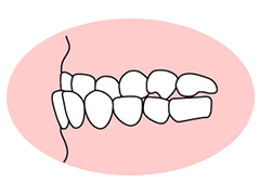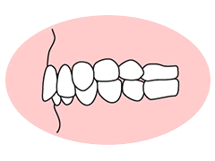| 上下の歯の中心がずれ、咬み合わせの一部が交差しています。食べ物をすり潰す奥歯の働きが悪く、顔が歪んでしまうこともあります。 |