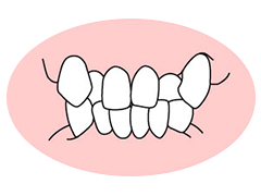 | 歯がデコボコしたり、重なりあって生えたりしている状態です。「八重歯(やえば)」や「乱杭歯(らんぐいし)」と呼ばれるものもこの一種です。ブラッシングをしても歯ブラシが届きにくく、虫歯や歯周病のリスクが高まります。 |